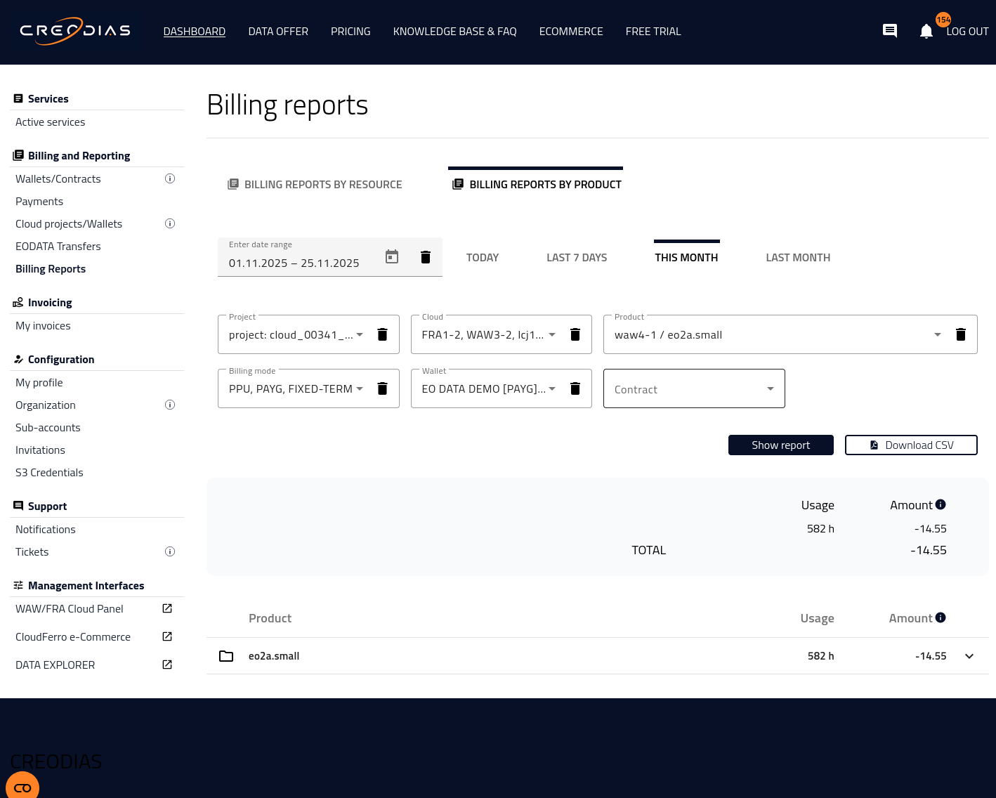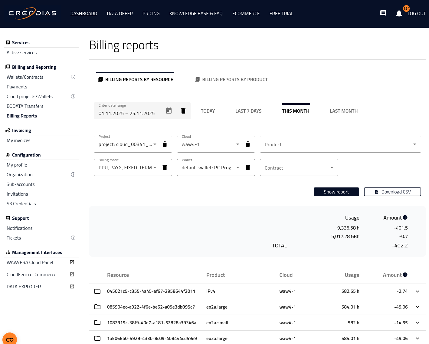 Monitoring cloud costs regularly helps you manage resource consumption and optimize spending. In the Creodias Dashboard, under Billing and Reporting → Billing Reports, you can view your usage and costs in two distinct ways:
