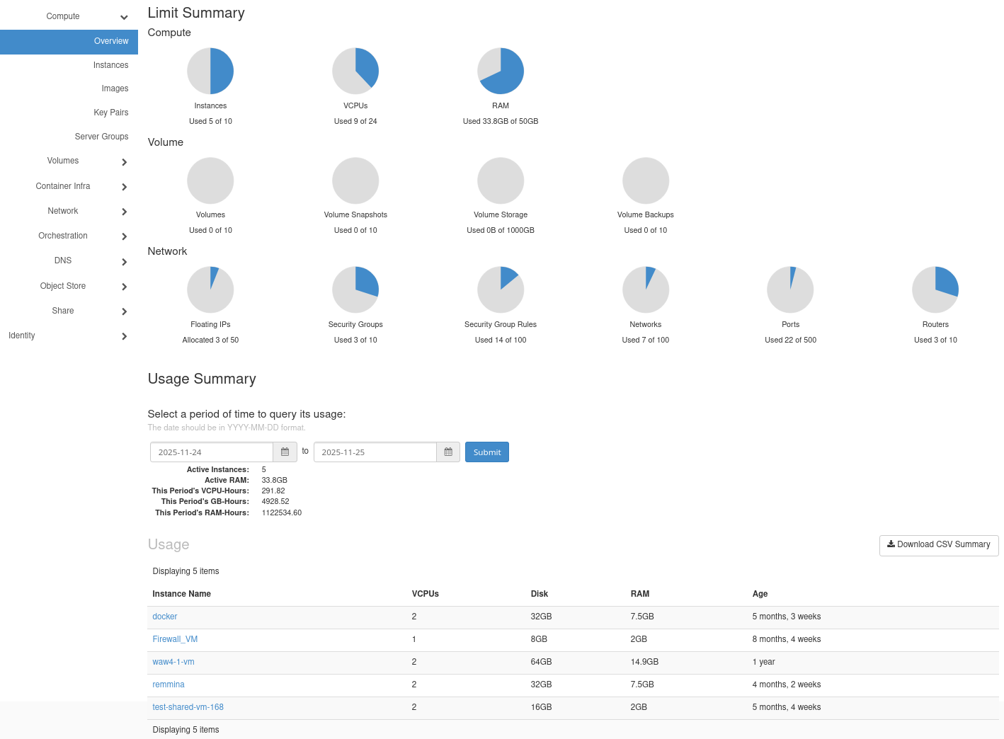 Before comparing billing reports, it helps to know which instances and flavors are active during the billing period. You can check this in Horizon → Compute → Overview → Usage Summary, as shown below.